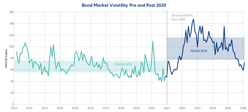 ICE BofA US Bond Market Option Volatility Estimate (MOVE) Index reflecting the level of volatility across US Treasuries. Source: Bloomberg March 2026.