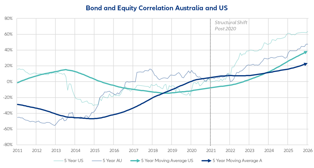 5 year trailing correlation of monthly returns of equity and bond indices Jan 2010 to February 2026. US - Bloomberg US Aggregate Index and S&P 500 Index. AU - Bloomberg AusBond Composite Index and ASX 200. Source Bloomberg March 2026.